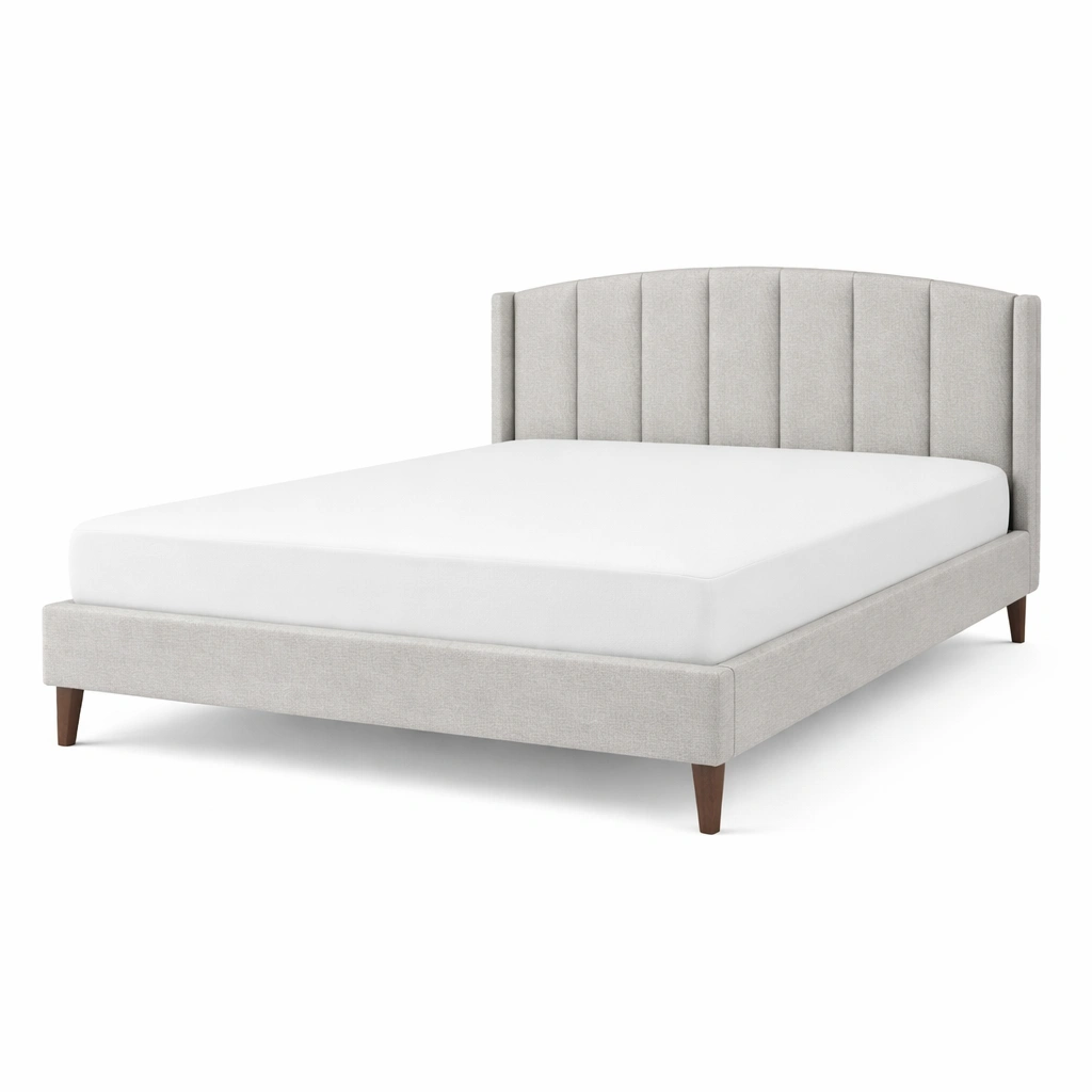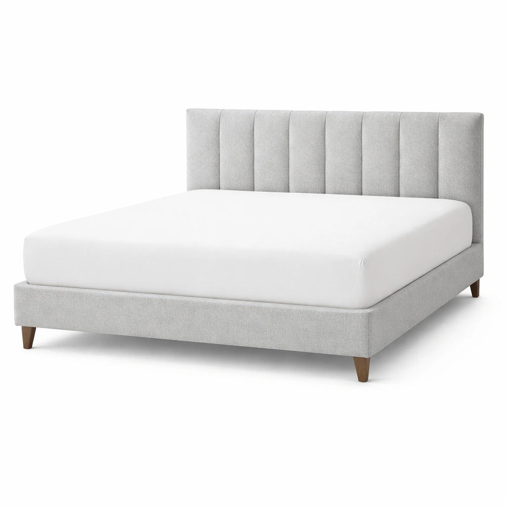 Estructura de cama tapizada de tela gris claro con patas de madera