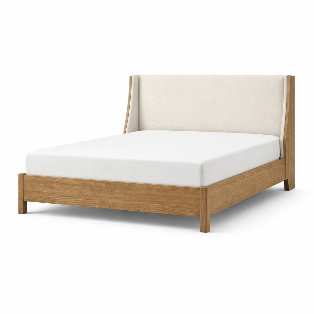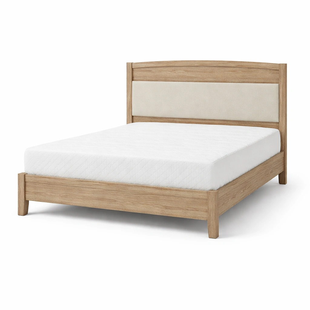 Estructura de cama de madera de roble con cabecera tapizada en beige