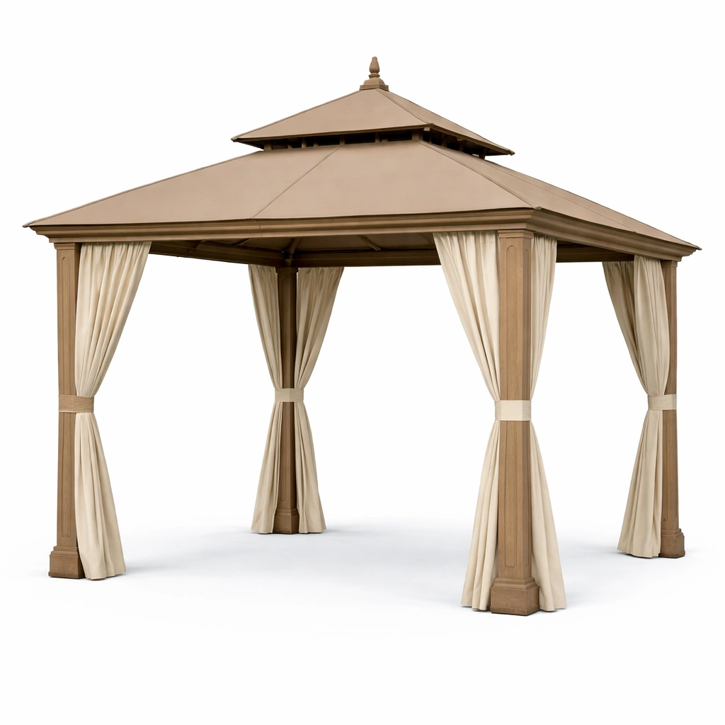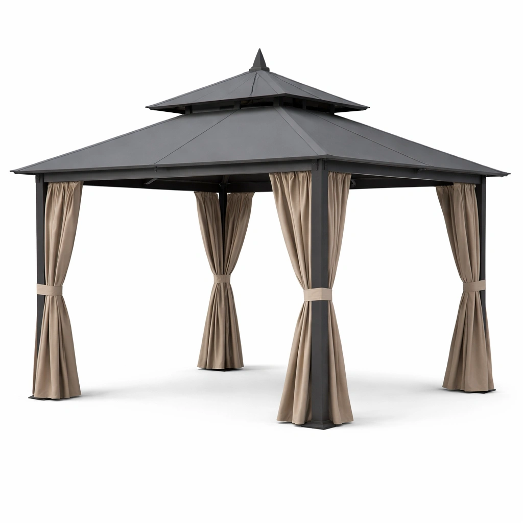 Gazebo de jardín de aluminio gris con cortinas de poliéster beige 300x300x270 cm
