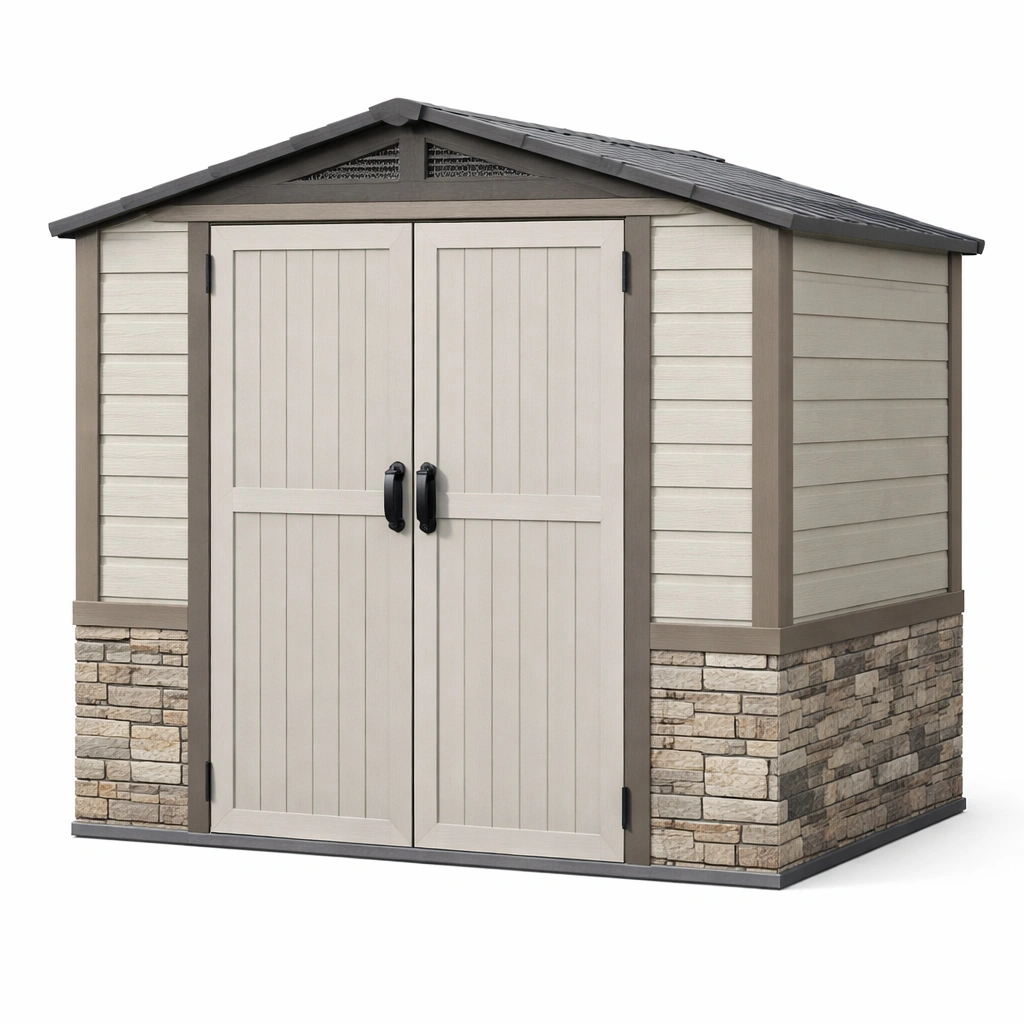 Este cobertizo de jardín está fabricado con resina de polipropileno y paneles de imitación piedra. Sus dimensiones son 250 cm de largo, 150 cm de ancho y 210 cm de alto. El color es Beige y Marrón. Requiere ensamblaje y es resistente al agua, adecuado para uso en exteriores. Incluye paneles, techo, puertas, conectores y herrajes.