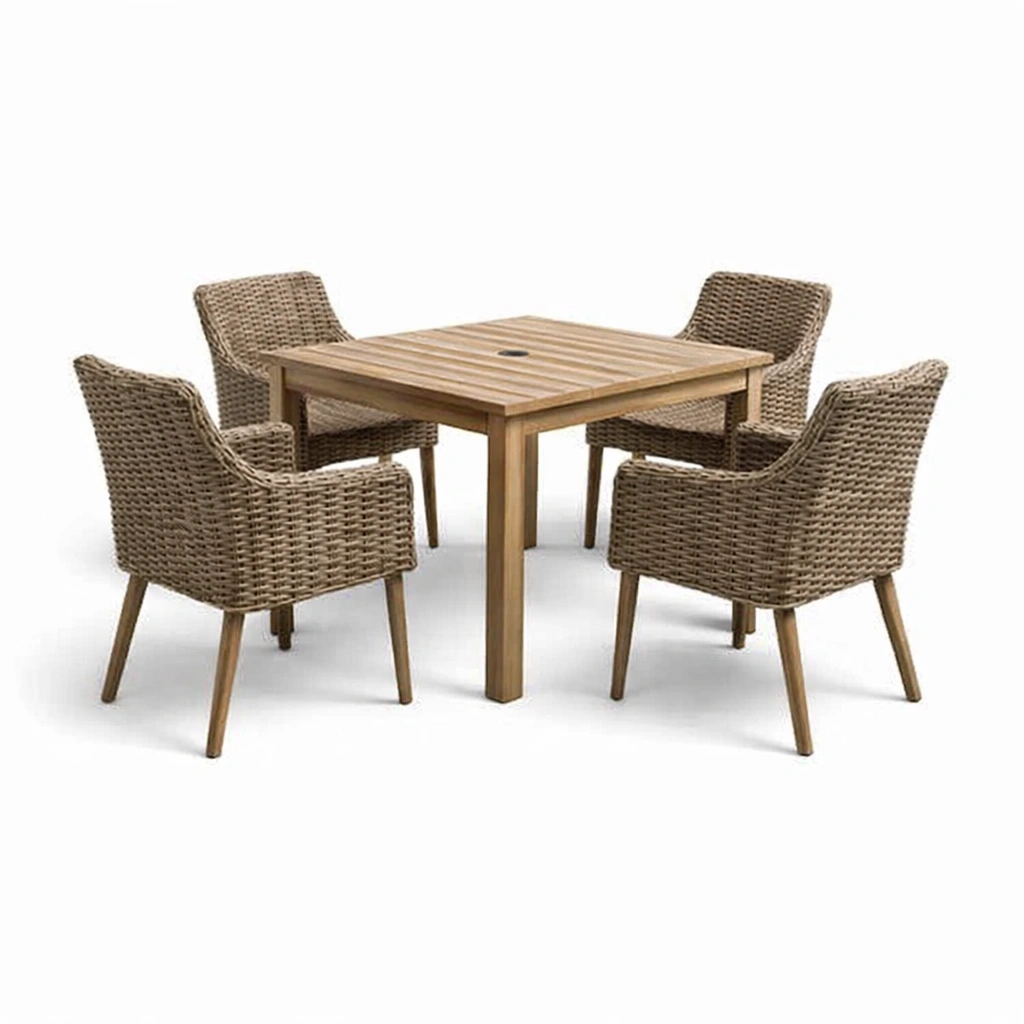 Este conjunto incluye una mesa cuadrada de teca y cuatro sillas de ratán sintético. La estructura de la mesa es robusta, mientras que las sillas están fabricadas en ratán sintético que imita el mimbre. La mesa cuenta con un agujero para sombrilla y las sillas tienen un respaldo alto.